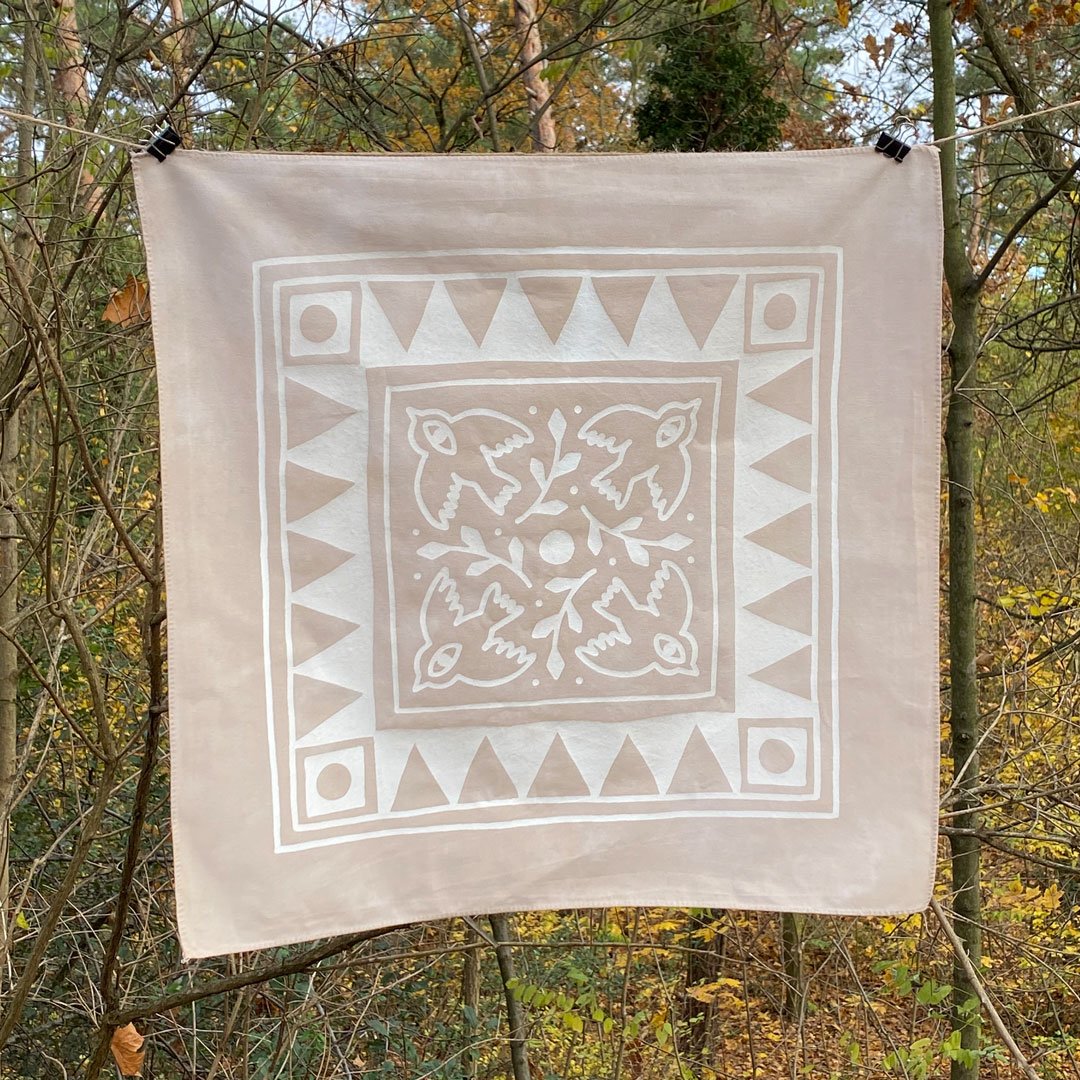 Screen printed limited edition cotton bandana in two colour ways. Naturally dyed with tea, each bandana is unique due to the individual dyeing process.